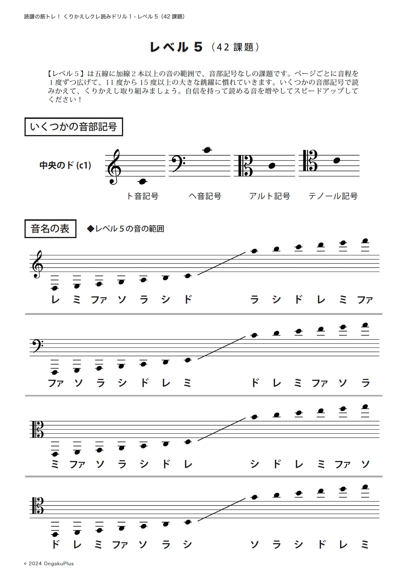 【レベル5】は五線に加線2本以上の音の範囲で、音部記号なしの課題です。ページごとに音程を1度ずつ広げて、11度から15度以上の大きな跳躍に慣れていきます。いくつかの音部記号で読みかえて、くりかえし取り組みましょう。自信を持って読める音を増やしてスピードアップしてください!