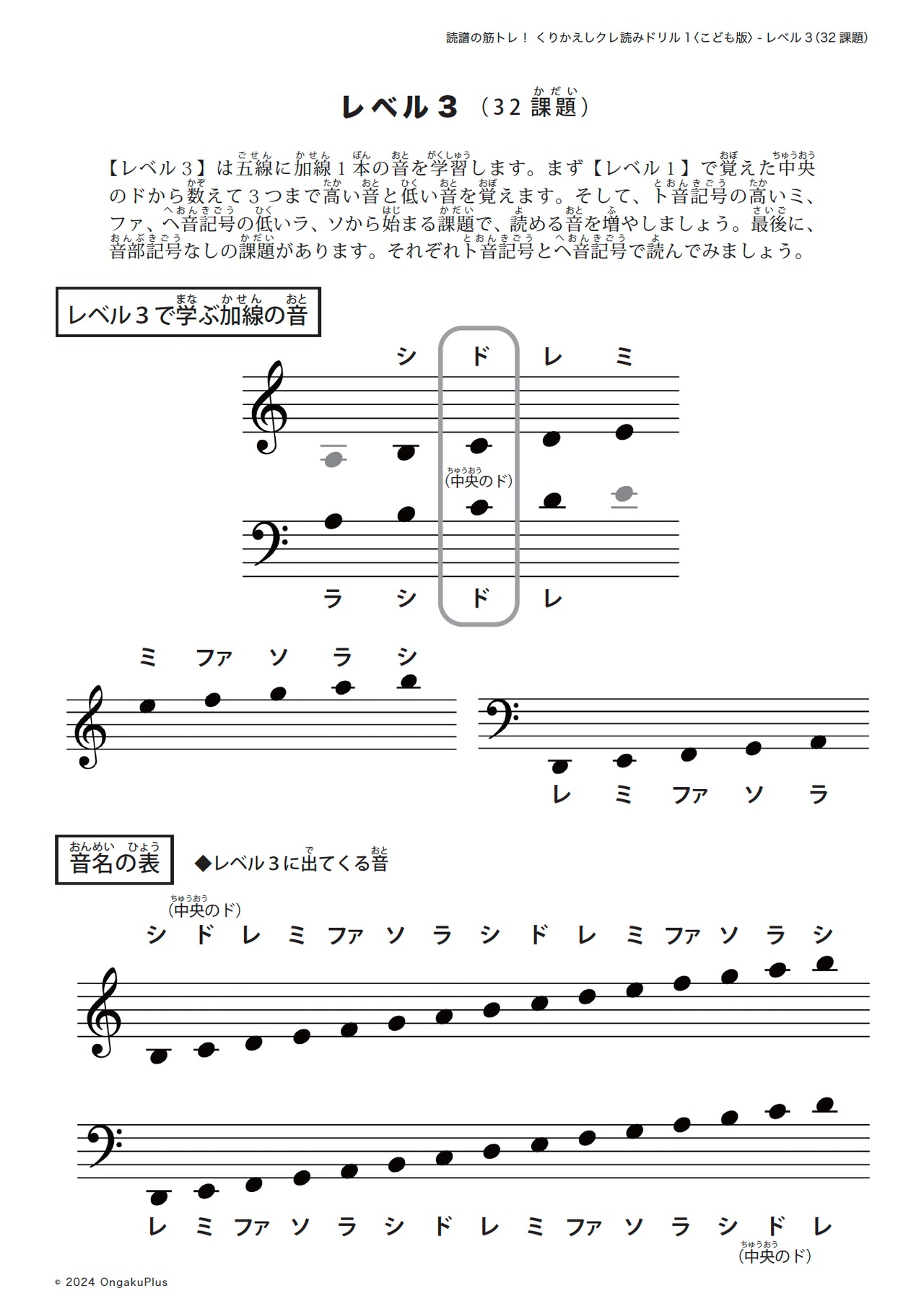 学習する音の範囲: 五線に加線1本(4度音程の範囲)