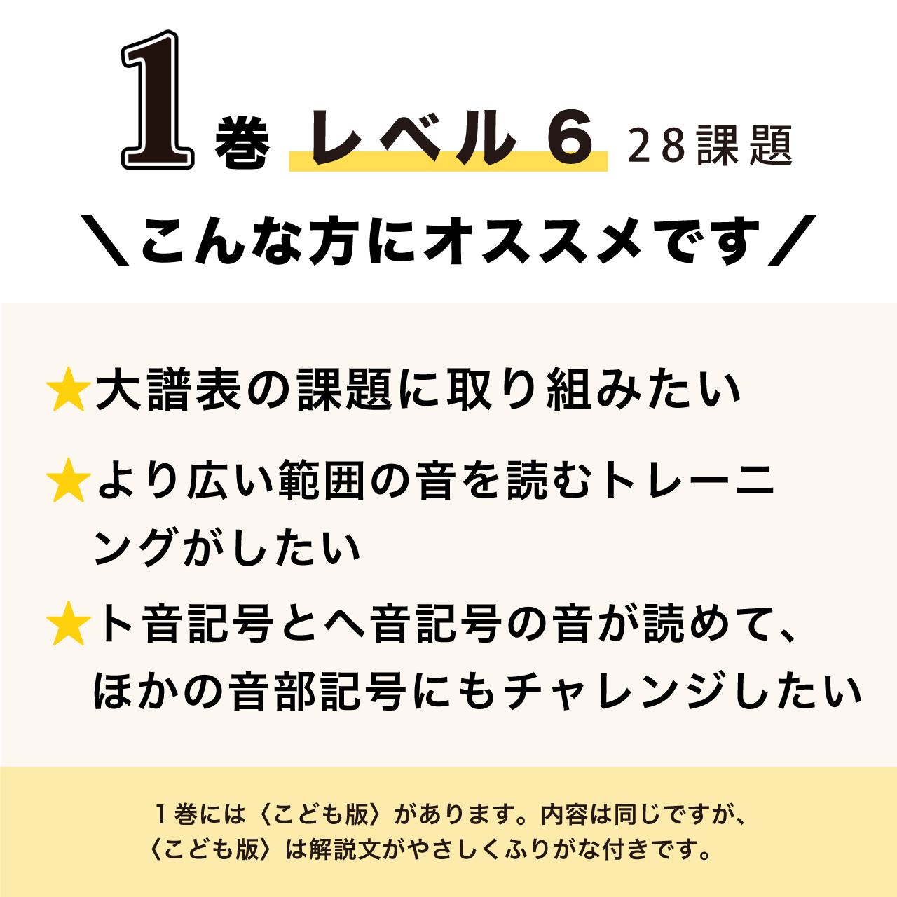 【レベル6】は大譜表の課題で学習します。1巻の復習にもなります。音がいくつはなれているかを考えながら、できるだけすばやく読みましょう。後半は音部記号なしの課題です。いくつかの音部記号を組み合わせて、くりかえしチャレンジ!