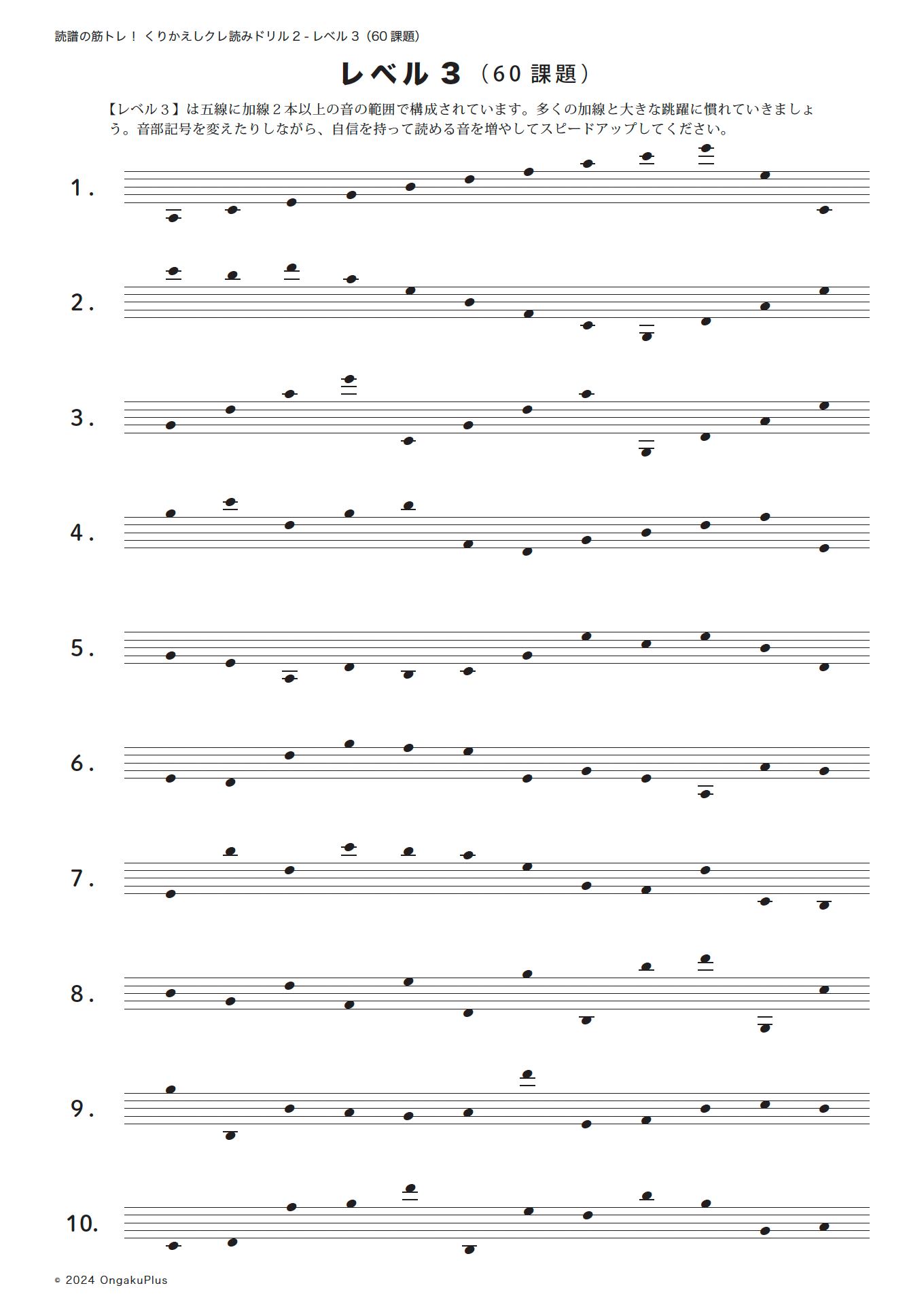 【レベル3】は五線に加線2本以上の音の範囲で構成されています。多くの加線と大きな跳躍に慣れていきましょう。音部記号を変えたりしながら、自信を持って読める音を増やしてスピードアップしてください。