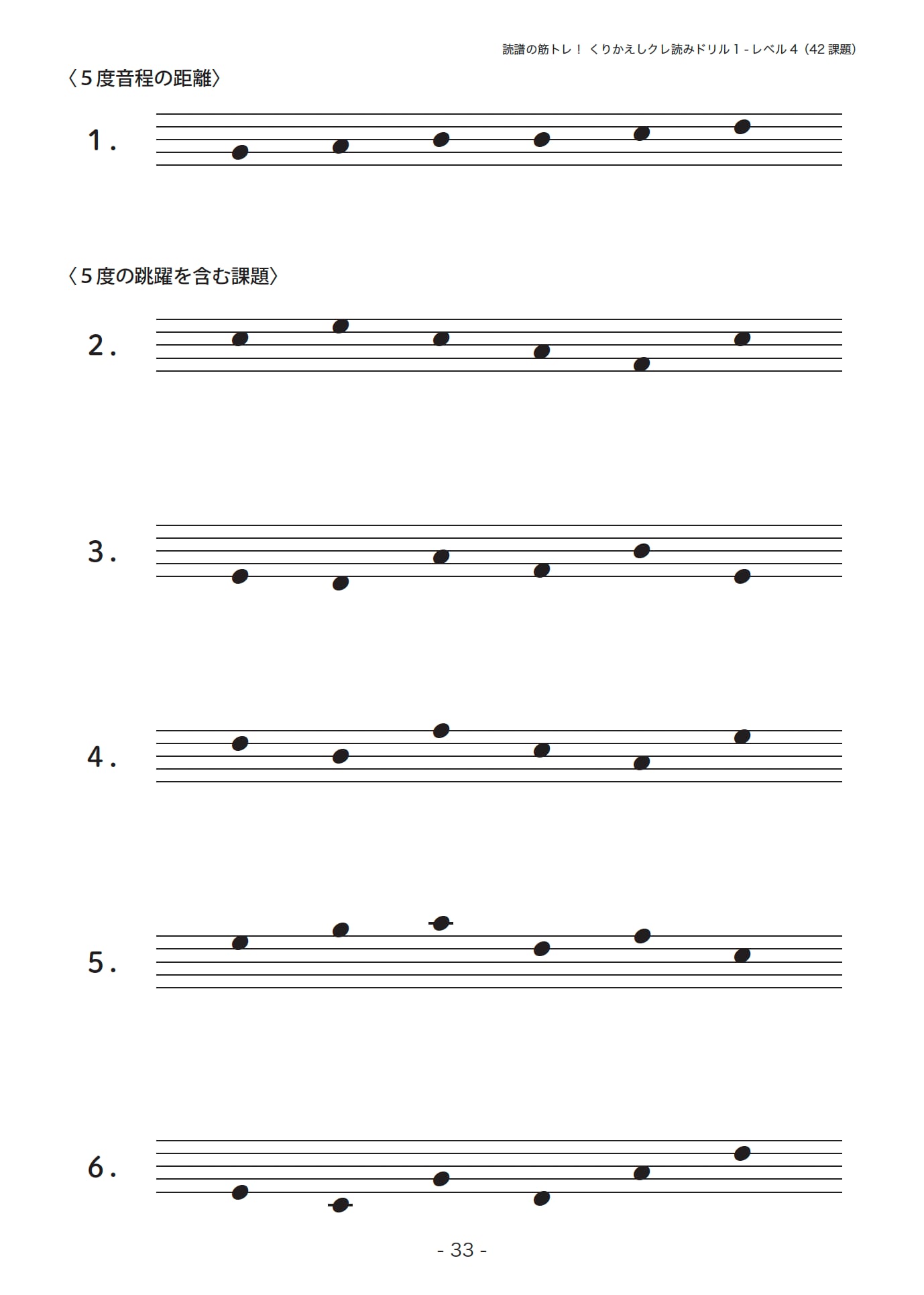 【レベル4】は五線に加線1本の音の範囲で【レベル3】と同じですが、音部記号なしの課題で、5度から11度音程までの跳躍を含みます。ページごとに音程を1度ずつ広げていきます。線と間を正確に読み取り、音同士の距離の感覚を鍛えましょう。いくつかの音部記号で読みかえたり、慣れてきたらスピードアップしてください。